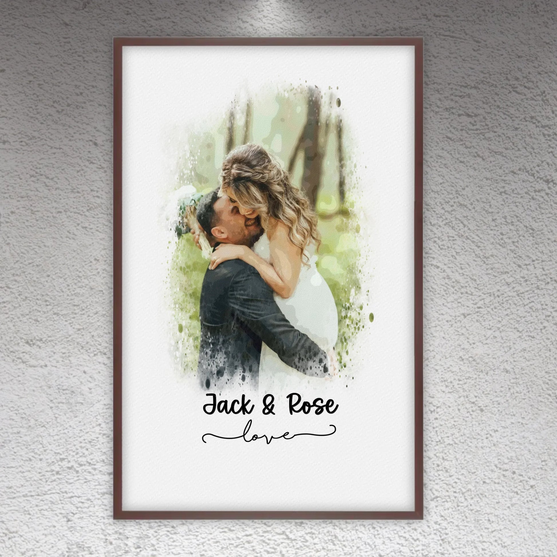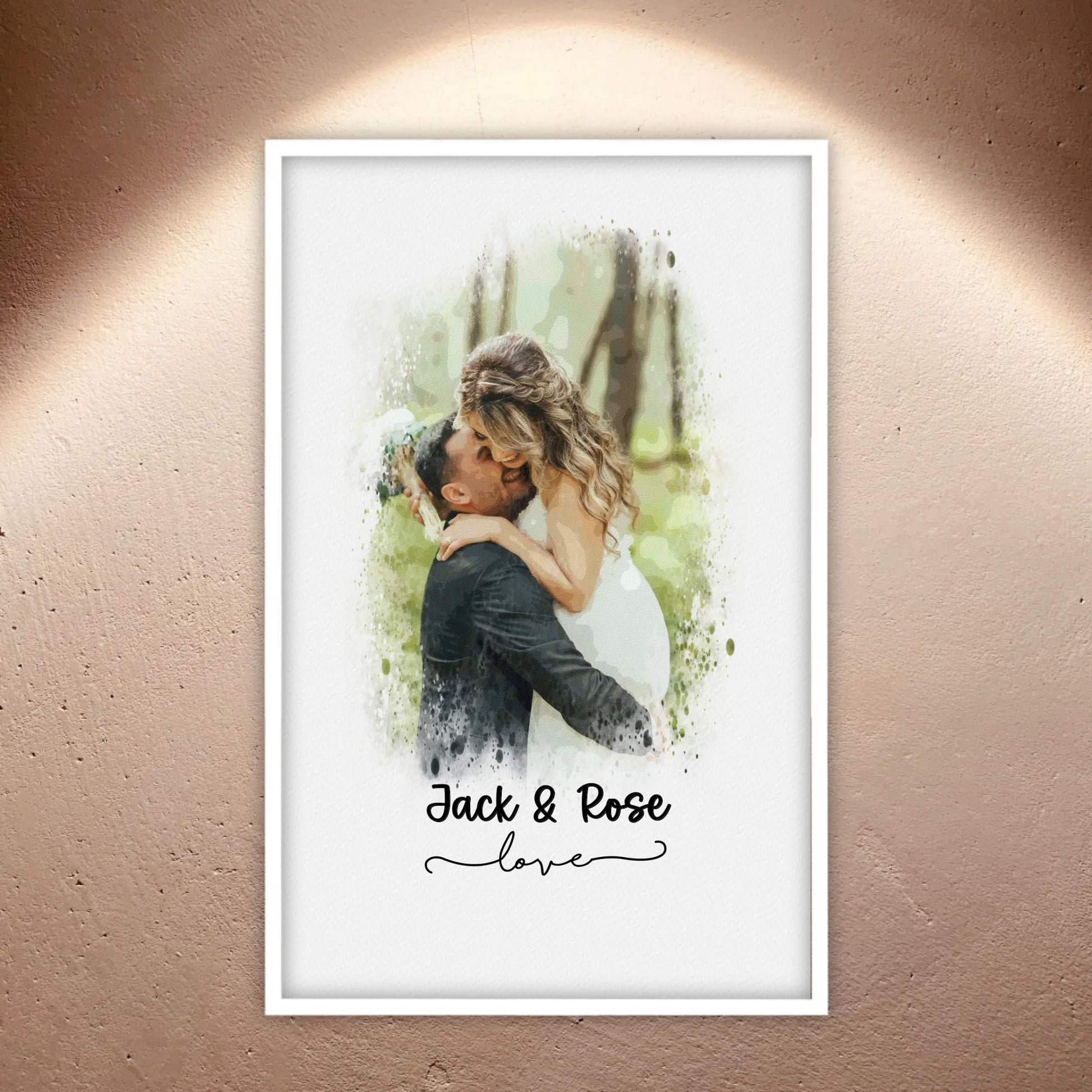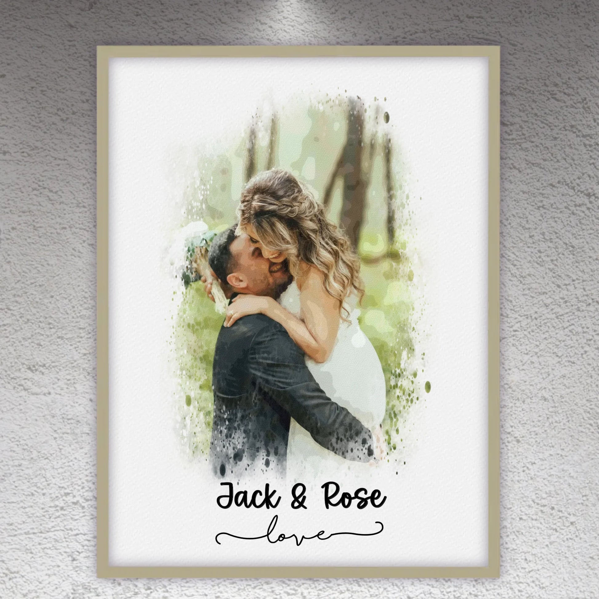Verwandeln Sie Ihr liebstes Hochzeitsfoto in ein kunstvolles Meisterwerk! Diese personalisierte Leinwand fängt die Schönheit Ihres Paares in sanften Wasserfarben ein – ein romantisches Porträt, das Gefühle statt nur Momente bewahrt. Mit elegantem Galerierahmen ist es sofort bereit zum Aufhängen und wird zum Blickfang in jedem Raum. Perfekt als Hochzeitsgeschenk, Jahrestags-Überraschung oder um Ihre Liebesgeschichte täglich zu feiern. Jedes Stück ist einzigartig wie Ihre Beziehung.