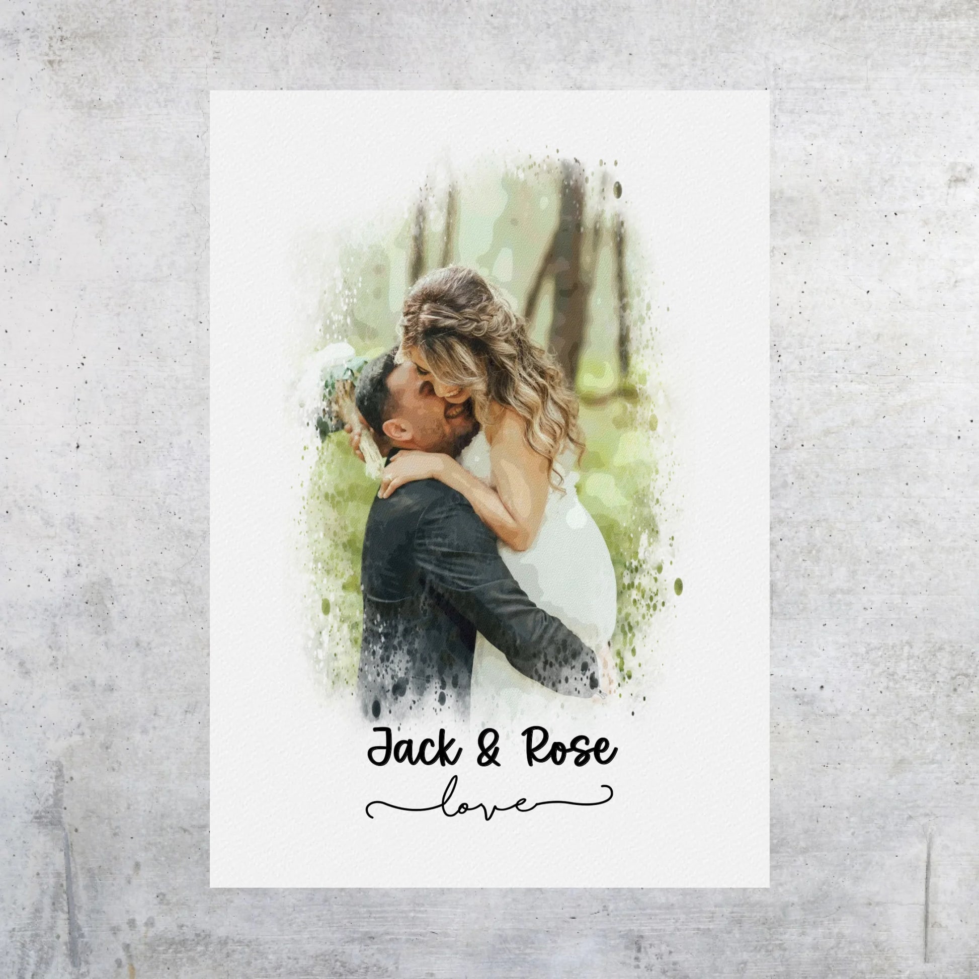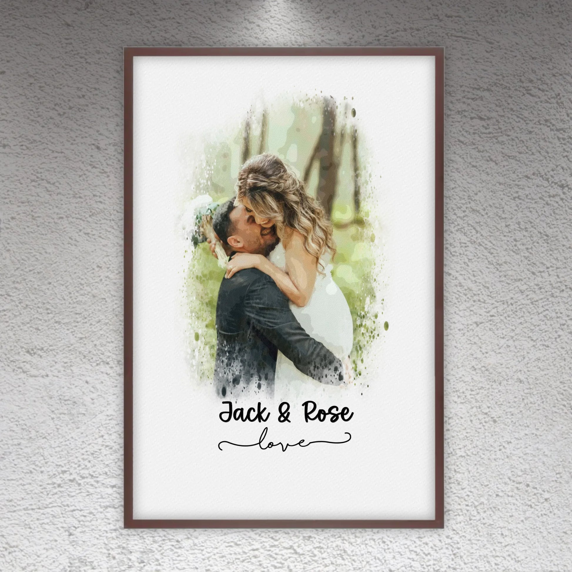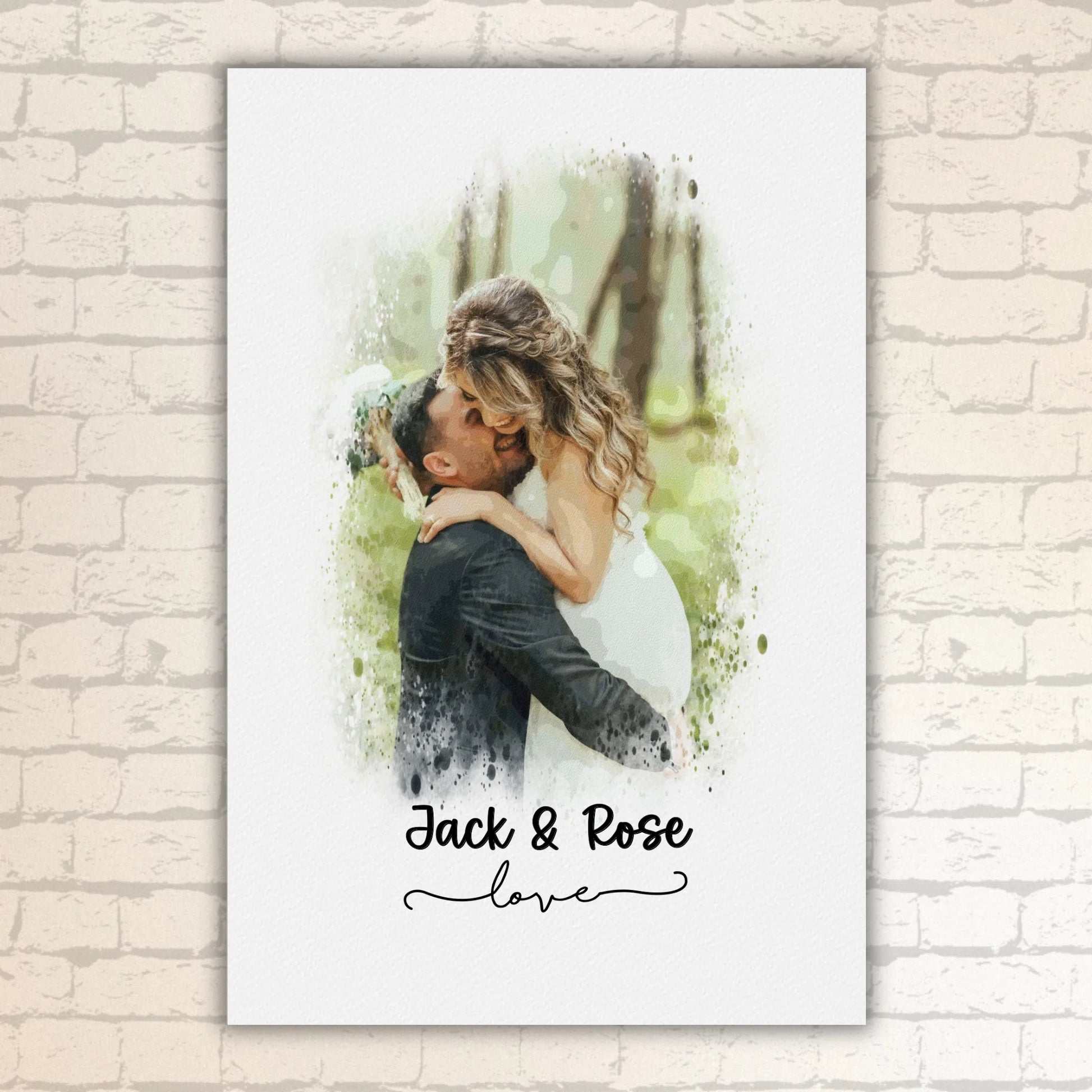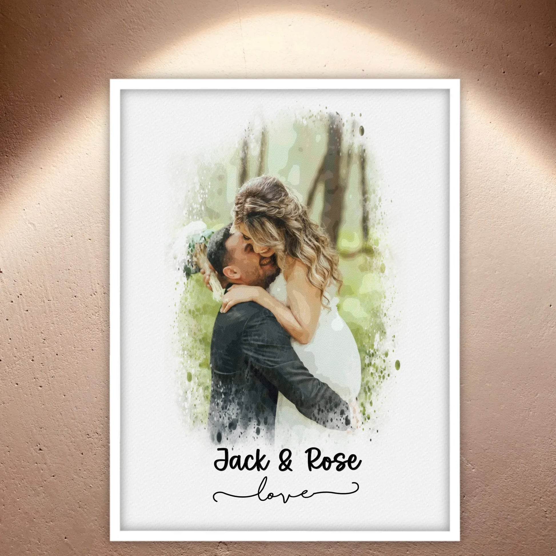 Verwandeln Sie Ihr liebstes Hochzeitsfoto in ein kunstvolles Meisterwerk! Diese personalisierte Leinwand fängt die Schönheit Ihres Paares in sanften Wasserfarben ein – ein romantisches Porträt, das Gefühle statt nur Momente bewahrt. Mit elegantem Galerierahmen ist es sofort bereit zum Aufhängen und wird zum Blickfang in jedem Raum. Perfekt als Hochzeitsgeschenk, Jahrestags-Überraschung oder um Ihre Liebesgeschichte täglich zu feiern. Jedes Stück ist einzigartig wie Ihre Beziehung.