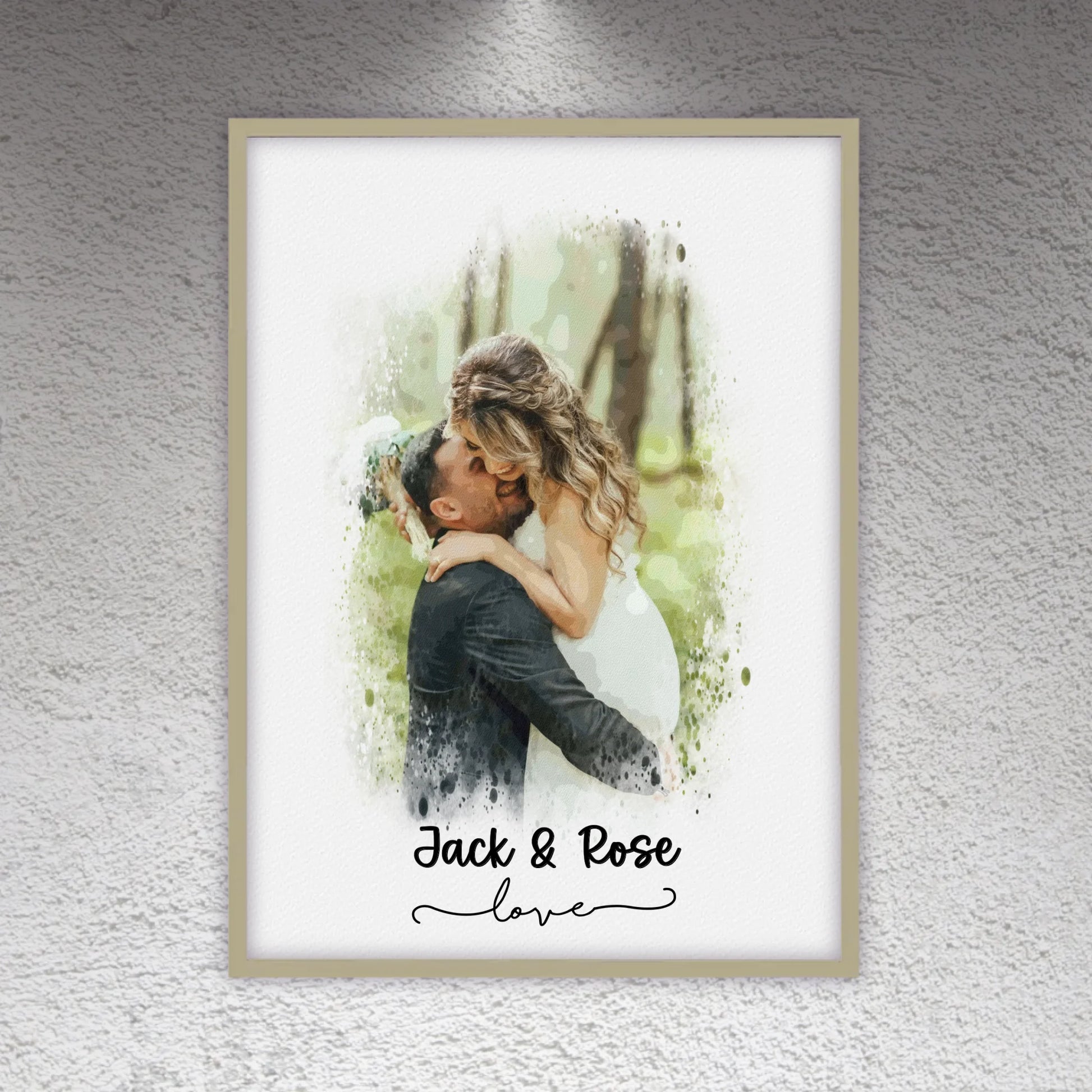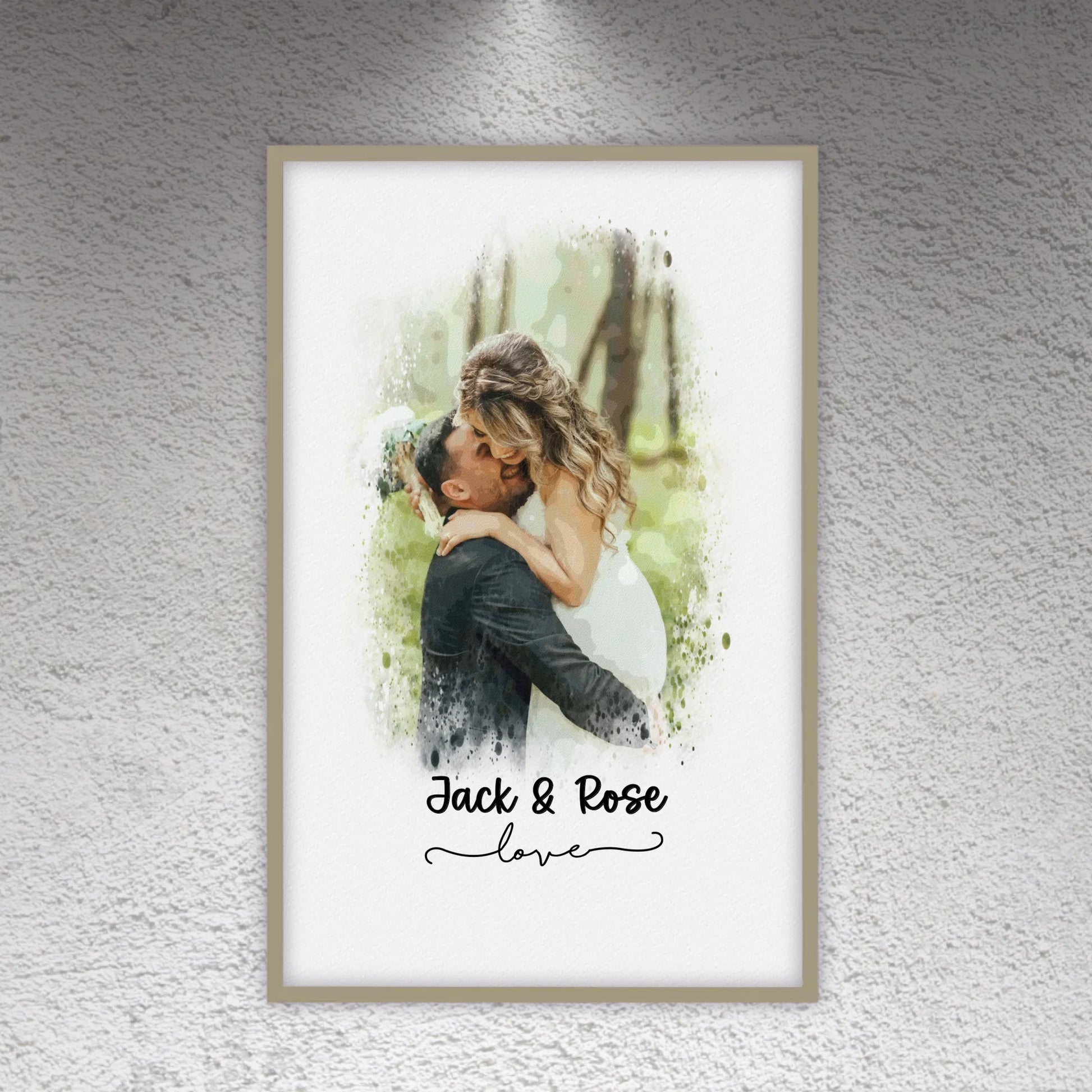 Hochzeitsfoto, Paar Leinwand, Porträt in Wasserfarben - individuelles Poster mit Galerierahmen