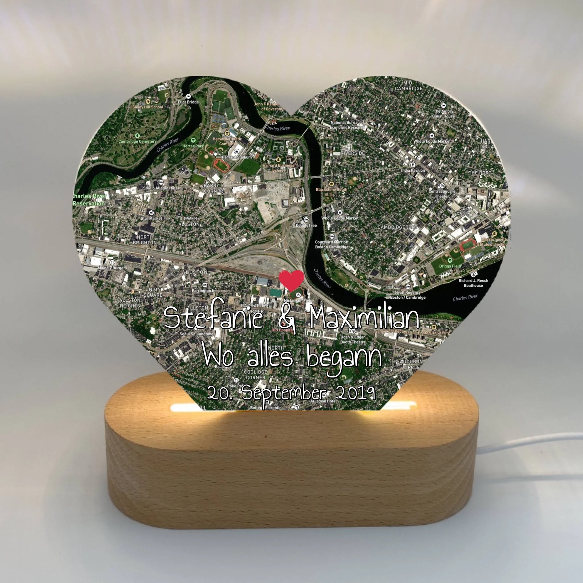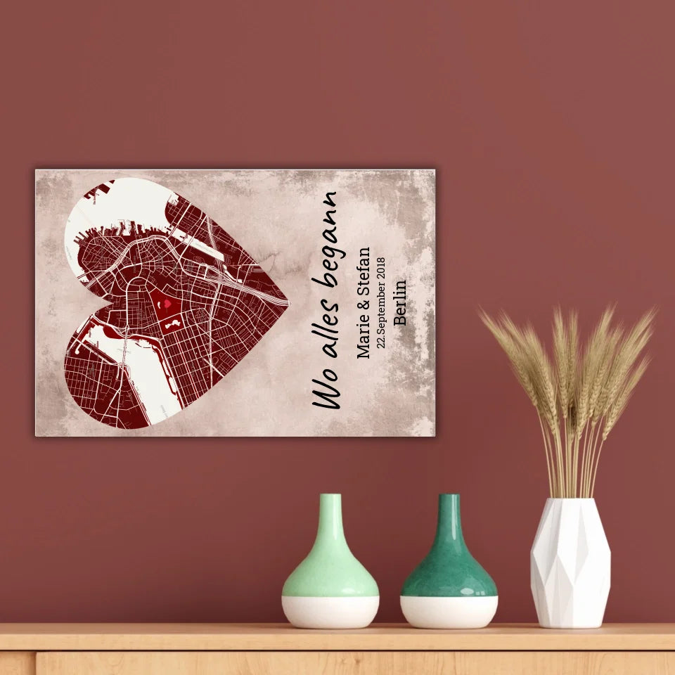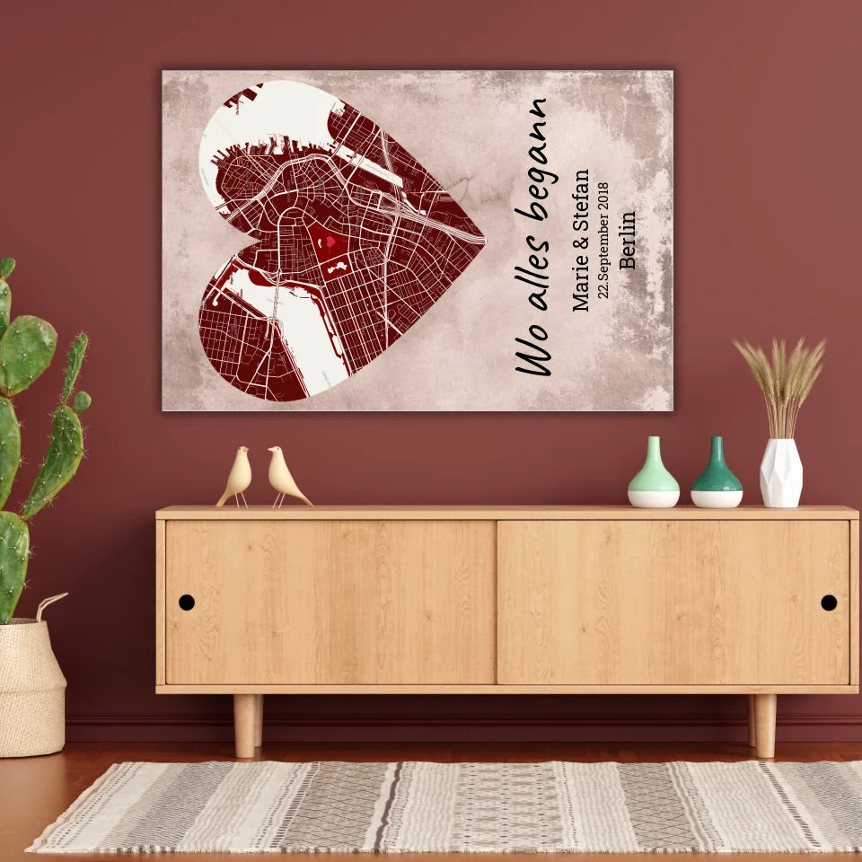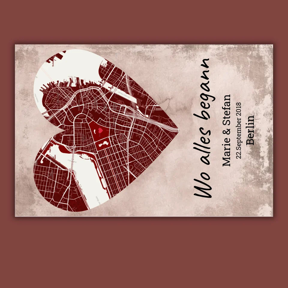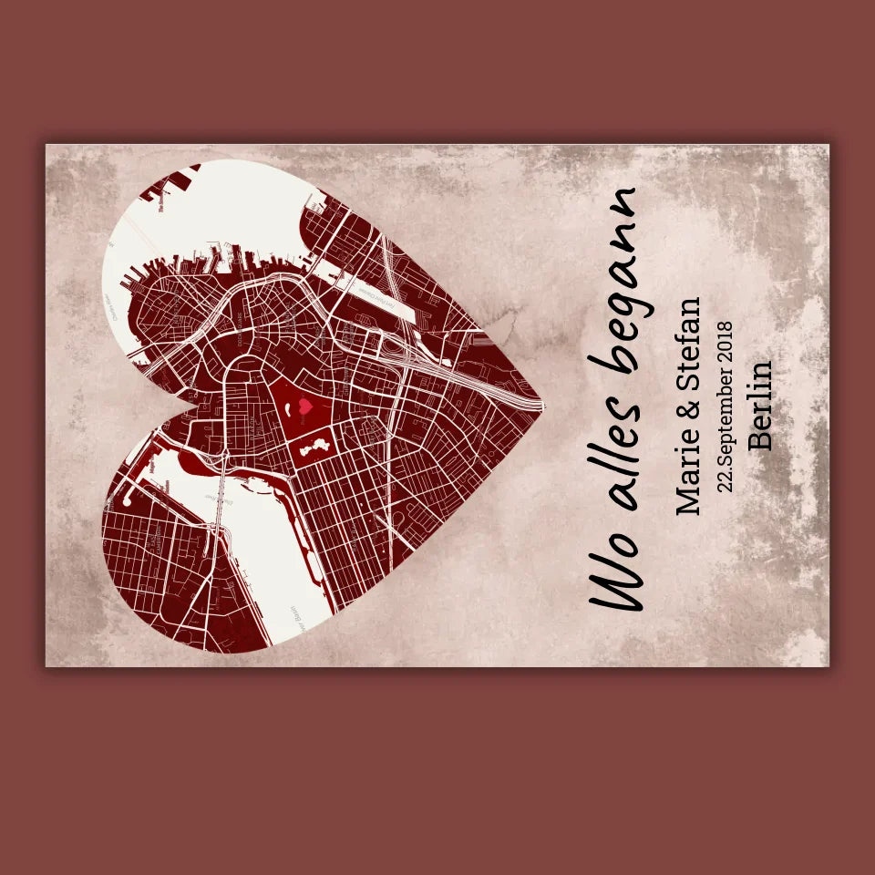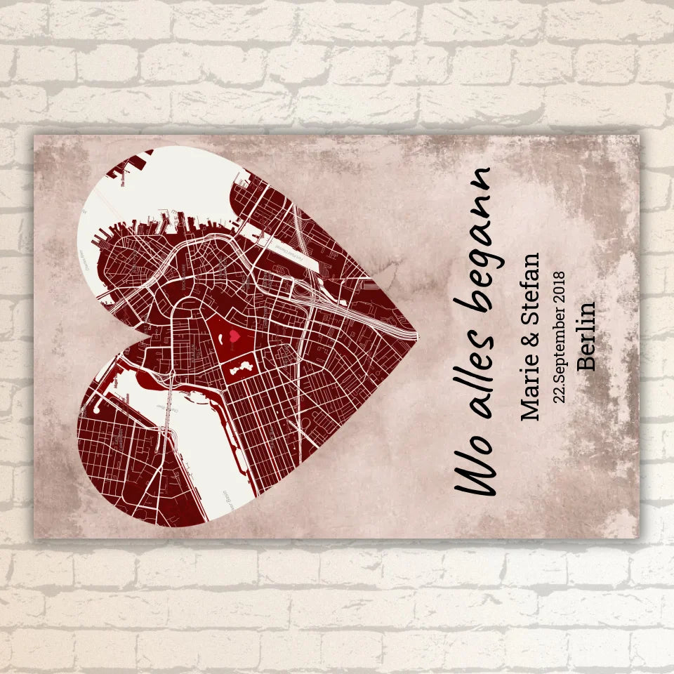 Herzförmiger Teppich mit eurer Stadtkarte. Personalisiere mit eurem persönlichen Ort, Namen und Datum. Gestalte jetzt euren neuen Hingucker.